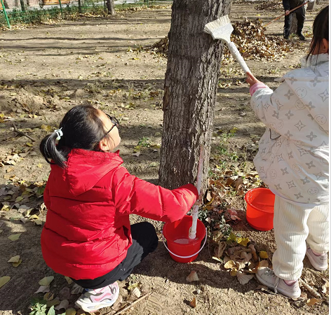 參觀結(jié)束后,學(xué)生們來到中心廣場,開始了“穿冬衣”活動。老師給大家講述冬衣的作用,冬衣怎么做,大家齊上陣,給大樹穿上過冬的衣服。學(xué)生們?yōu)樾浯┥系?ldquo;冬衣”防蟲防凍,成就感滿滿。