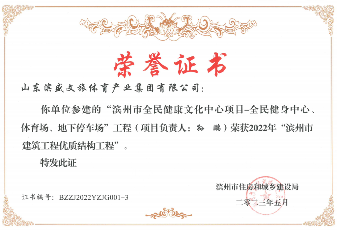 近日,2022年“濱州市建筑工程優(yōu)質(zhì)結(jié)構(gòu)工程”名單公布,山東濱盛文旅體育產(chǎn)業(yè)集團(tuán)有限公司建設(shè)的“濱州市全民健康文化中心項目-全民健身中心、體育場、地下停車場”工程位列其中。